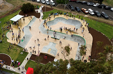 The new design features a bowl, quarter pipe, mini ramp, and a variety of hips and corners, and supporting infrastructure such as shade shelters, seating, lighting, landscaping, and pathways.